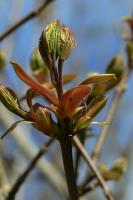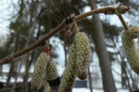 | Die männlichen und weiblichen Blüten der Hasel sind auch schon zu sehen. Da die Bestäubung durch den Wind erfolgt, sind die Blüten recht unscheinbar. Die weiblichen Blüten ähneln Knospen, aus denen jeweils Büschel roter Narben hervorragen . |